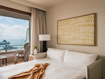 Precisa de espaço? Este é o lugar. Faça o check-in nesta suite 52m² com o seu quarto separado e cama king-size, e um salão com sofá-cama e quarto para um berço, se necessário. A casa de banho totalmente equipada tem um jacuzzi ou chuveiro, secador de cabelo, alisador de cabelo e produtos DE higiene pessoal. Por fim, dirija-se às janelas e delicie-se com as vistas deslumbrantes sobre a Baía de Palma, o porto e a catedral. Reserve este quarto e aproveite todas as vantagens exclusivas que RedLevel tem a oferecer.