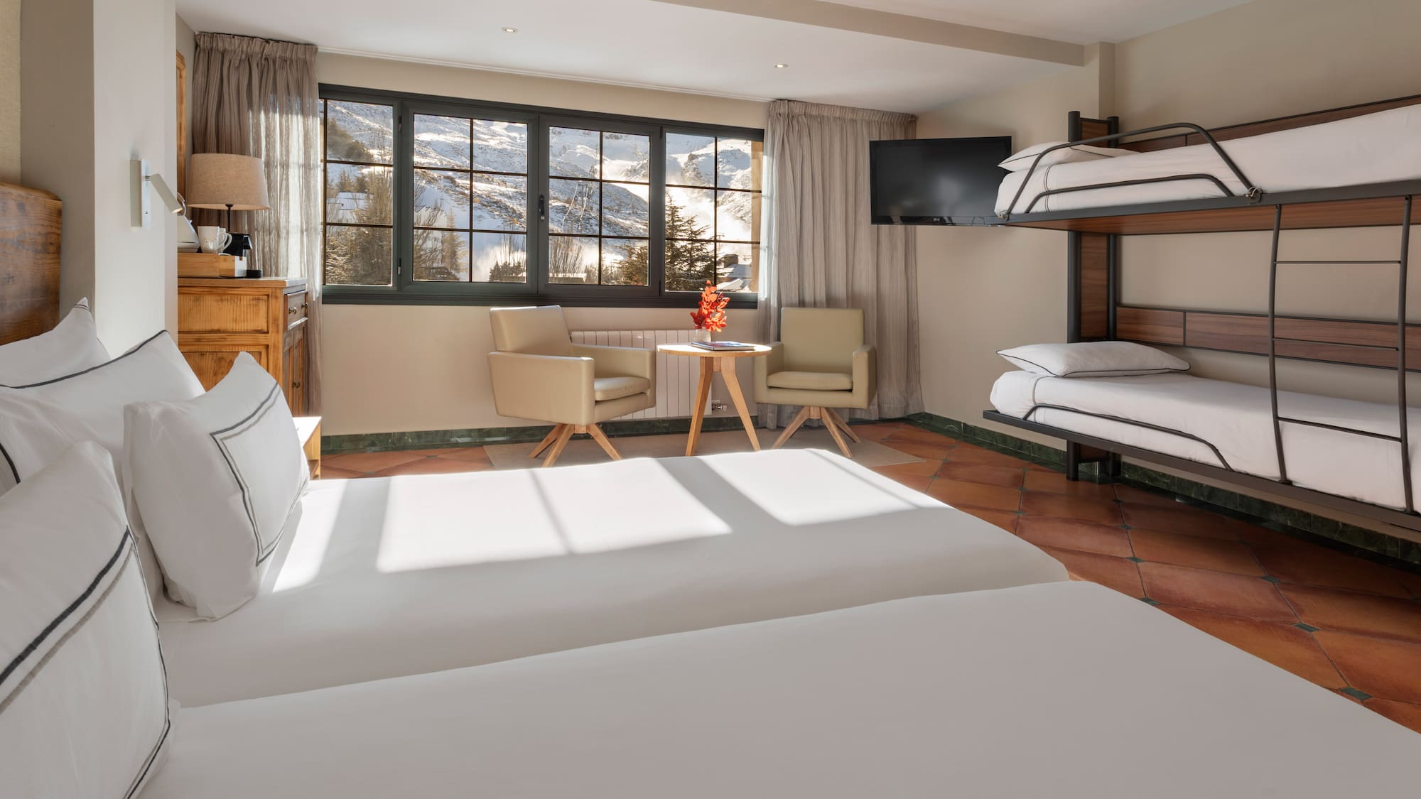Para quem esquia em família, esta espaçosa sala cheia de luz natural oferece o descanso de que todos precisam. Duas camas de solteiro e um beliche de solteiro confortável. Também oferece TV LCD de 43", mesa e banheiro totalmente equipado.