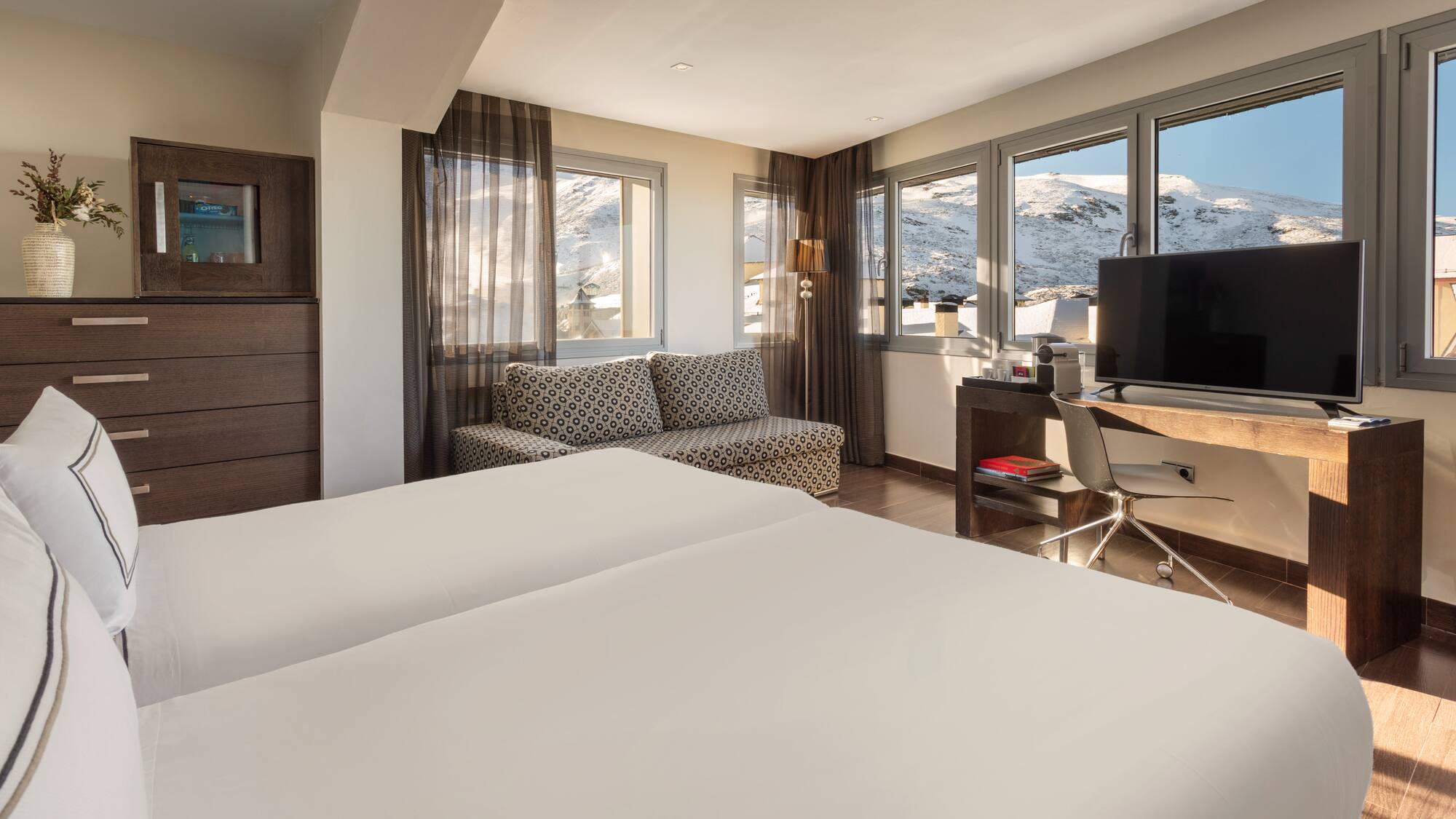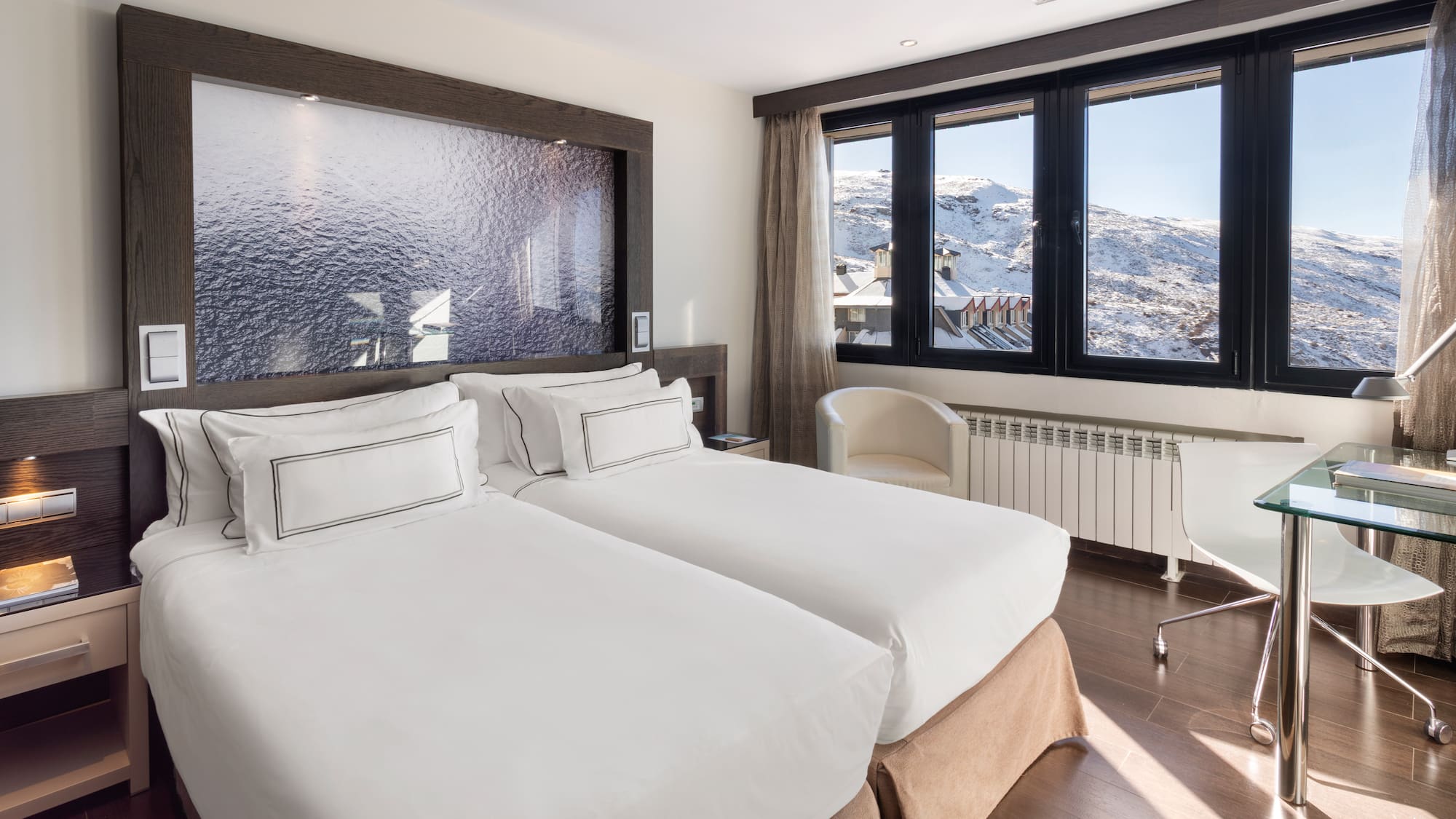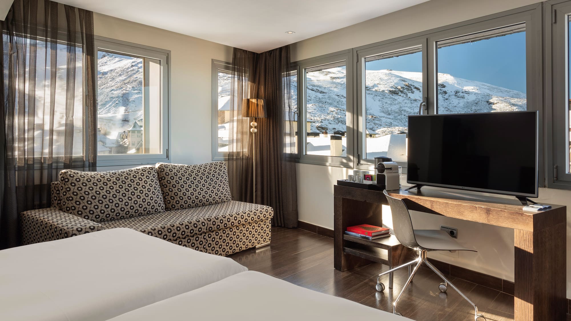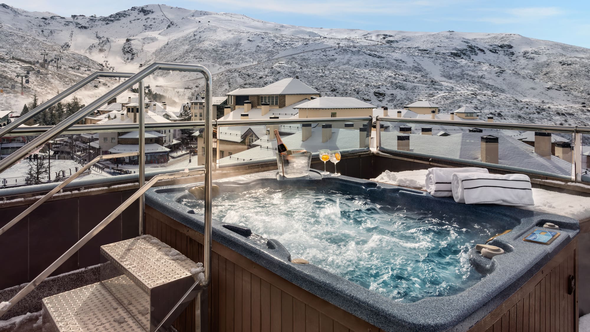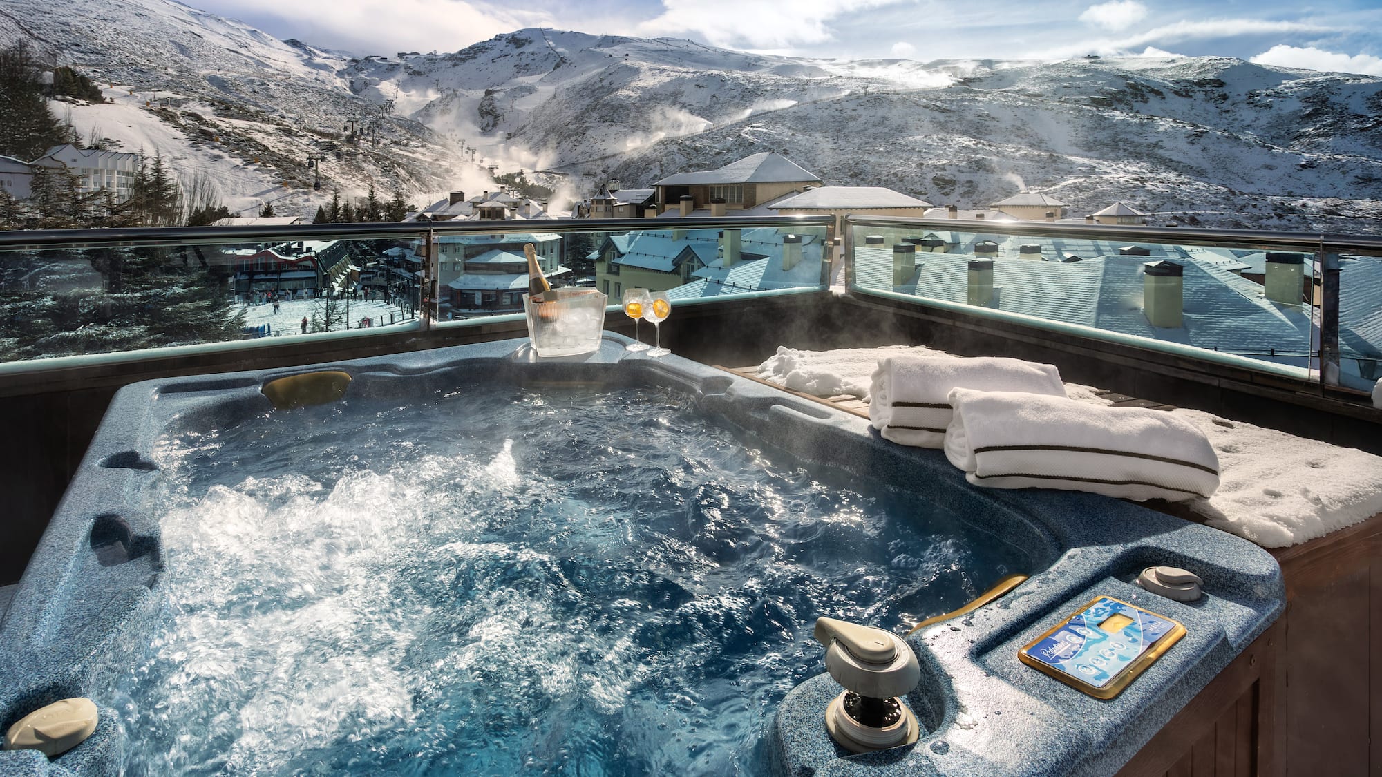 Desfrute de experiências excecionais contemplando a estância da Serra Nevada a partir de um terraço com banheira de hidromassagem, a cereja no topo do bolo para as suas férias de esqui. Este quarto é um refúgio perfeito para alguns dias de esqui em boa companhia.