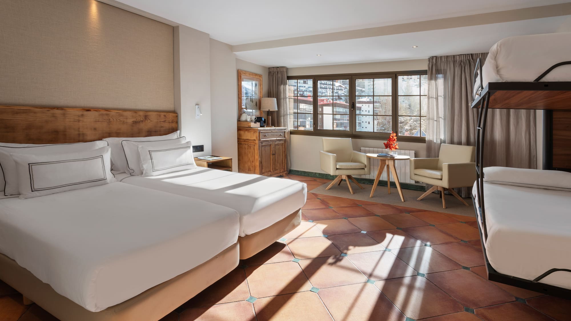 As suas férias de esqui em família desfrutarão de um refúgio perfeito neste quarto com vista para a montanha. Confortável e luminoso, tem um design sofisticado e todos os privilégios do The Level para a estadia mais memorável.