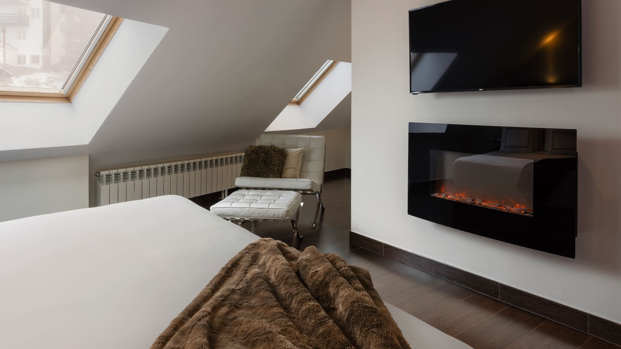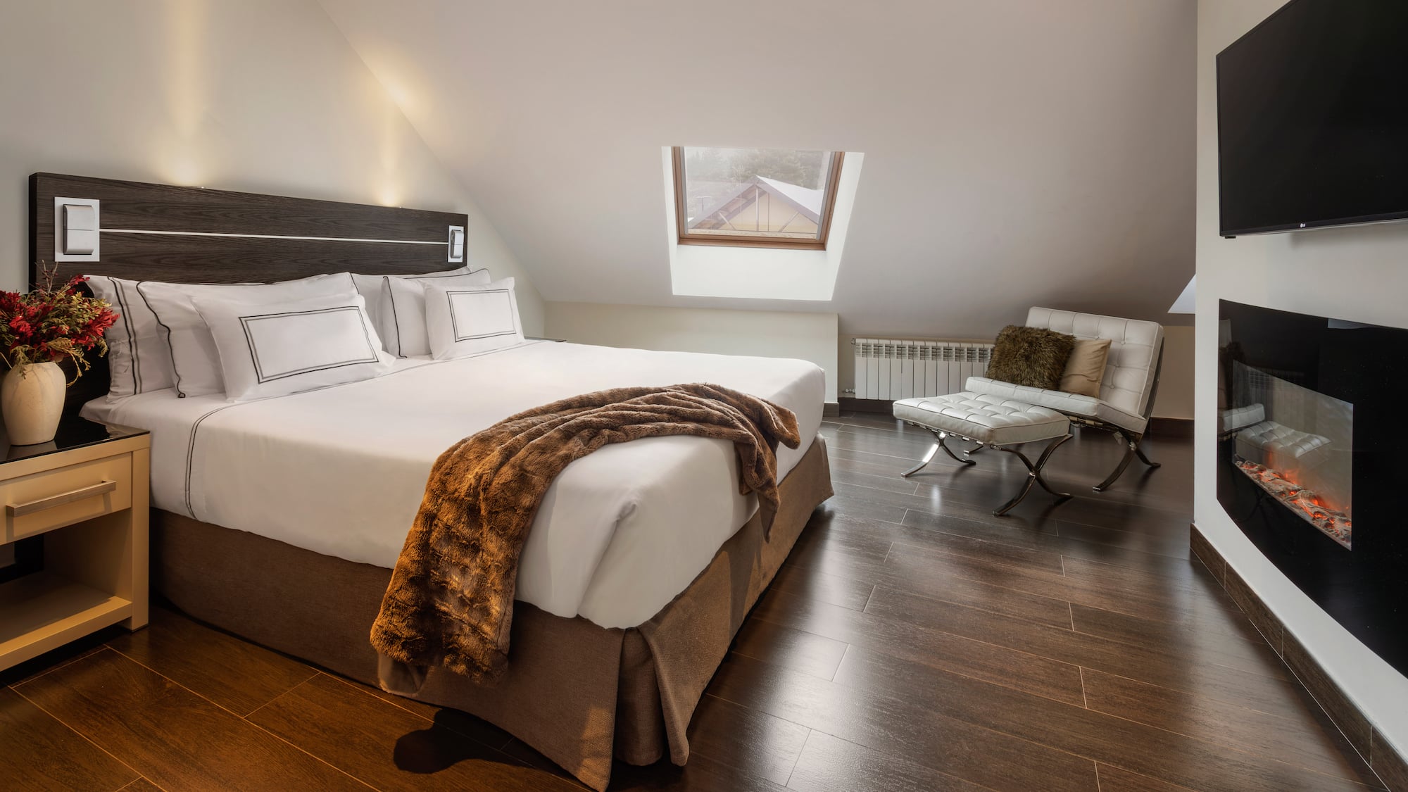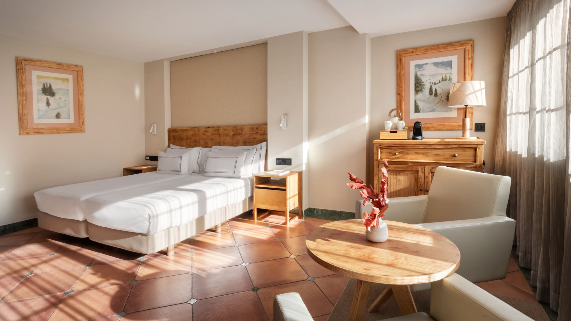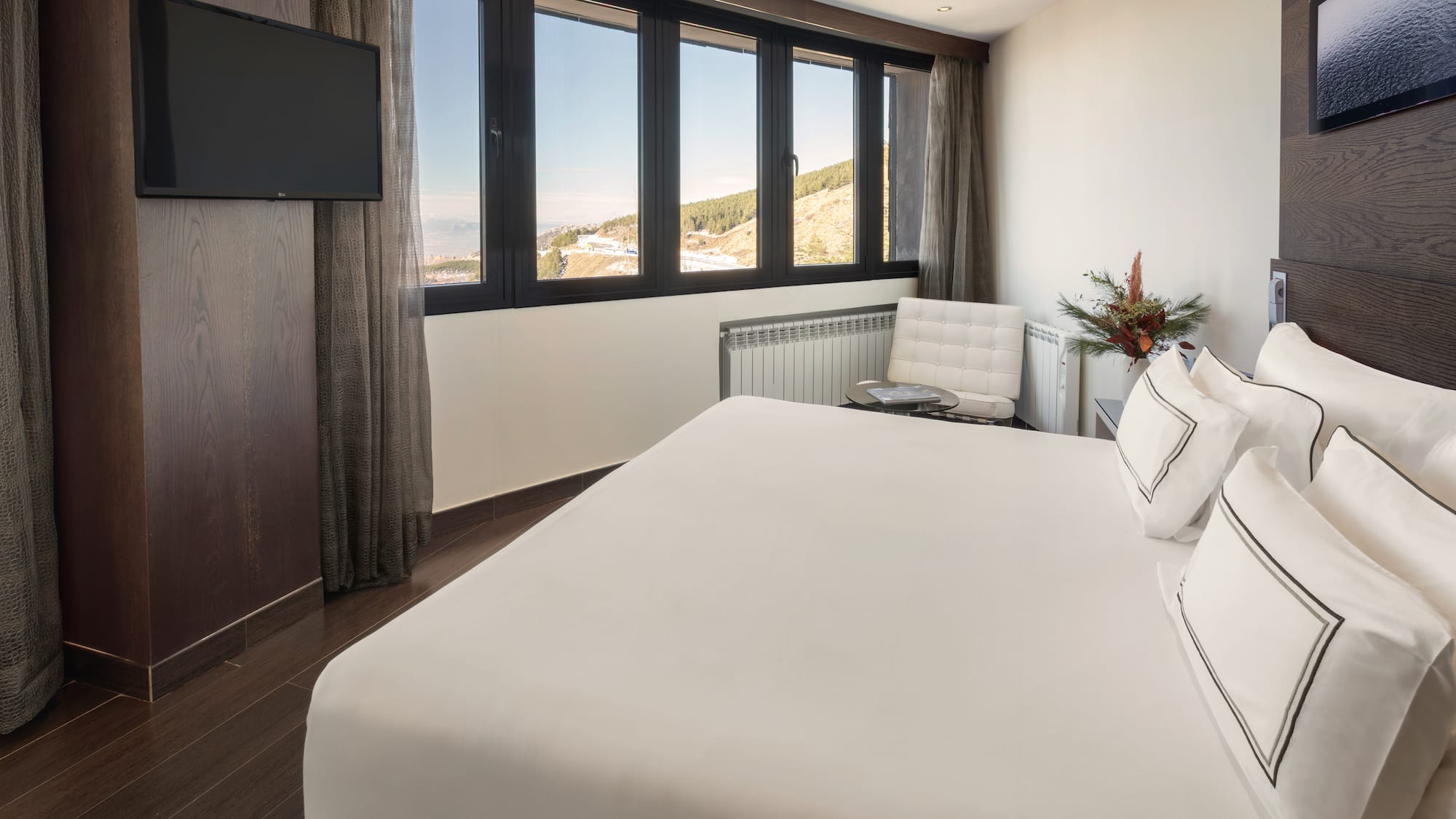 Luz natural abundante, num quarto perfeito para uma escapadinha à Serra Nevada. Quarto em open space, com zona de estar e quarto de vestir, usufruindo de uma vista maravilhosa para o cenário de neve.