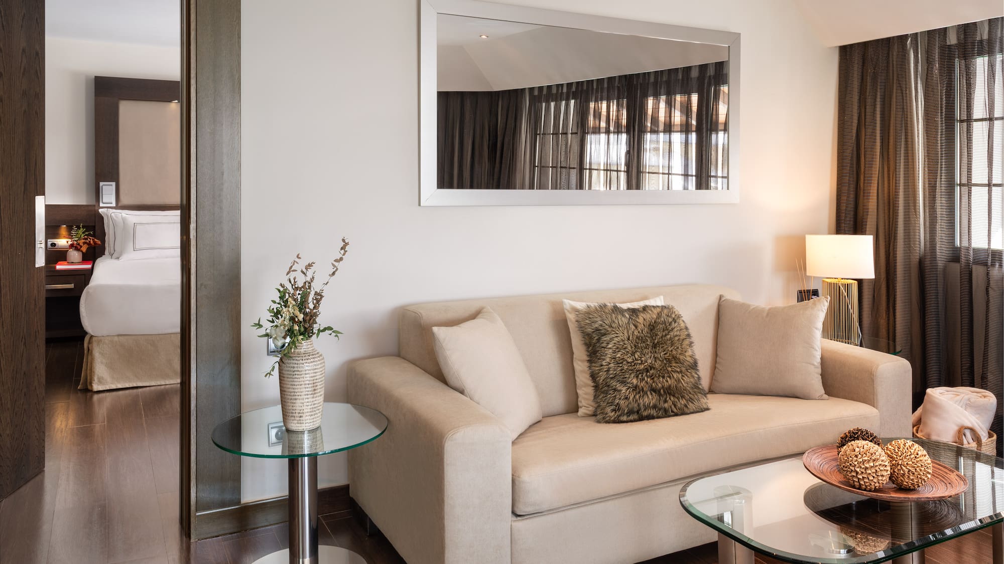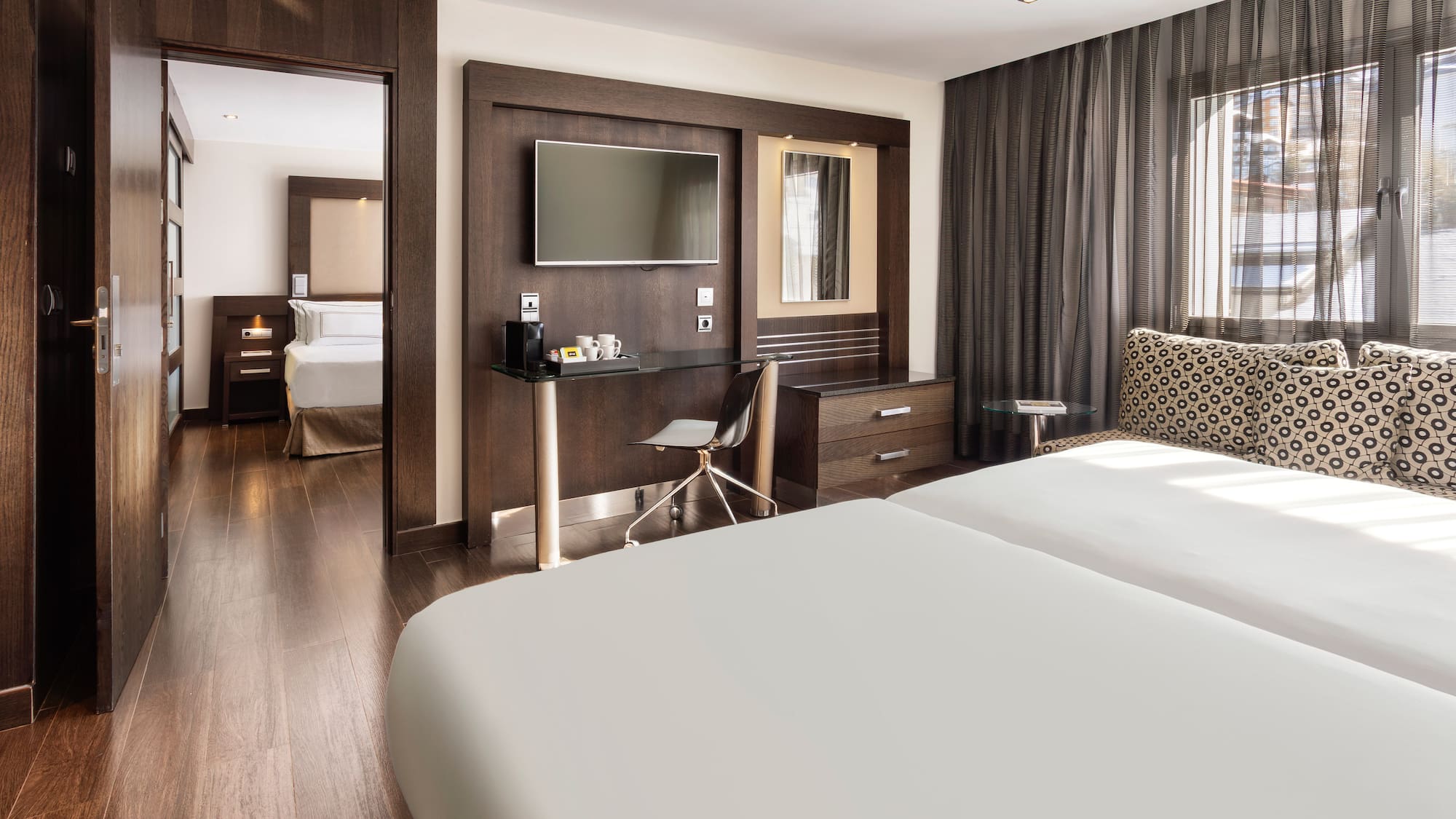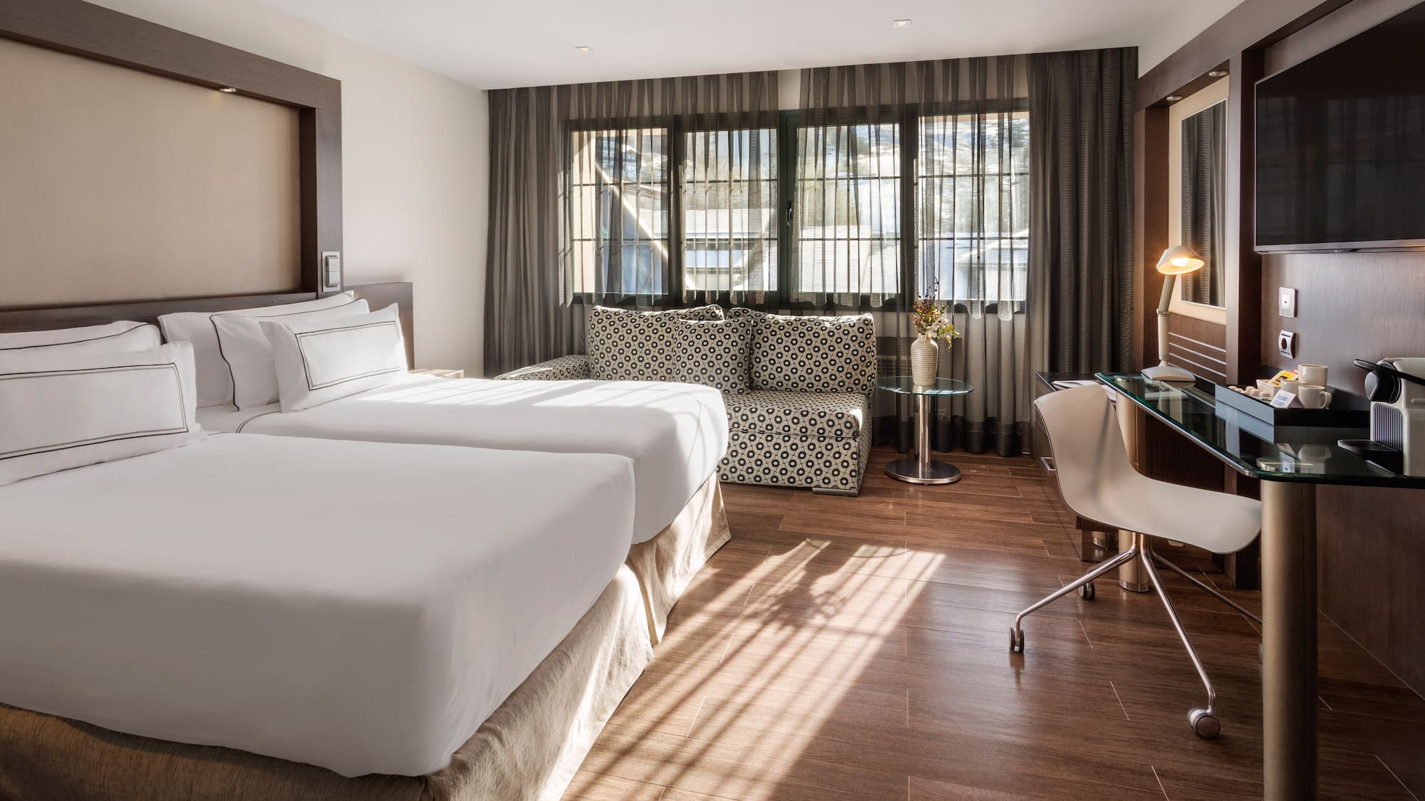 Desfrute do calor e do espaço desta sala especial. Com elegantes toques de madeira em seu design, possui duas camas de solteiro ou queen size e um confortável sofá para relaxar. Na casa de banho, a sensação agradável dos produtos de higiene pessoal da Rituals.
