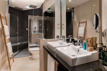 O cameră liniștită care creează toate condițiile necesare pentru odihnă și relaxare. Savurați o carte bună în patul dvs. dublu sau în fotoliu, în timp ce admirați priveliștea orașului sau chiar într-o baie relaxantă cu articole de toaletă Rituals.