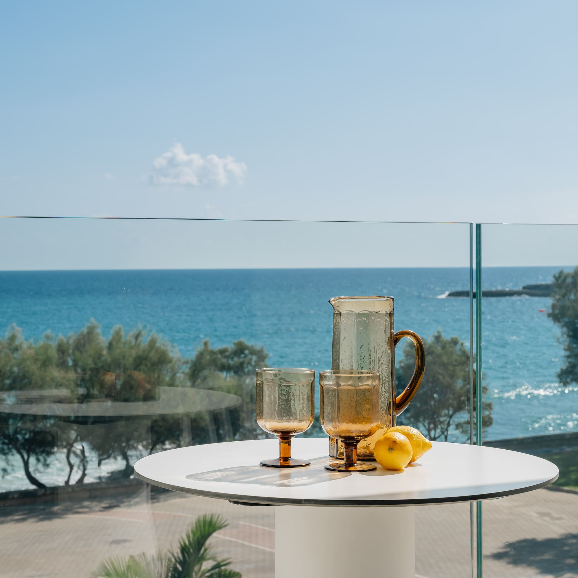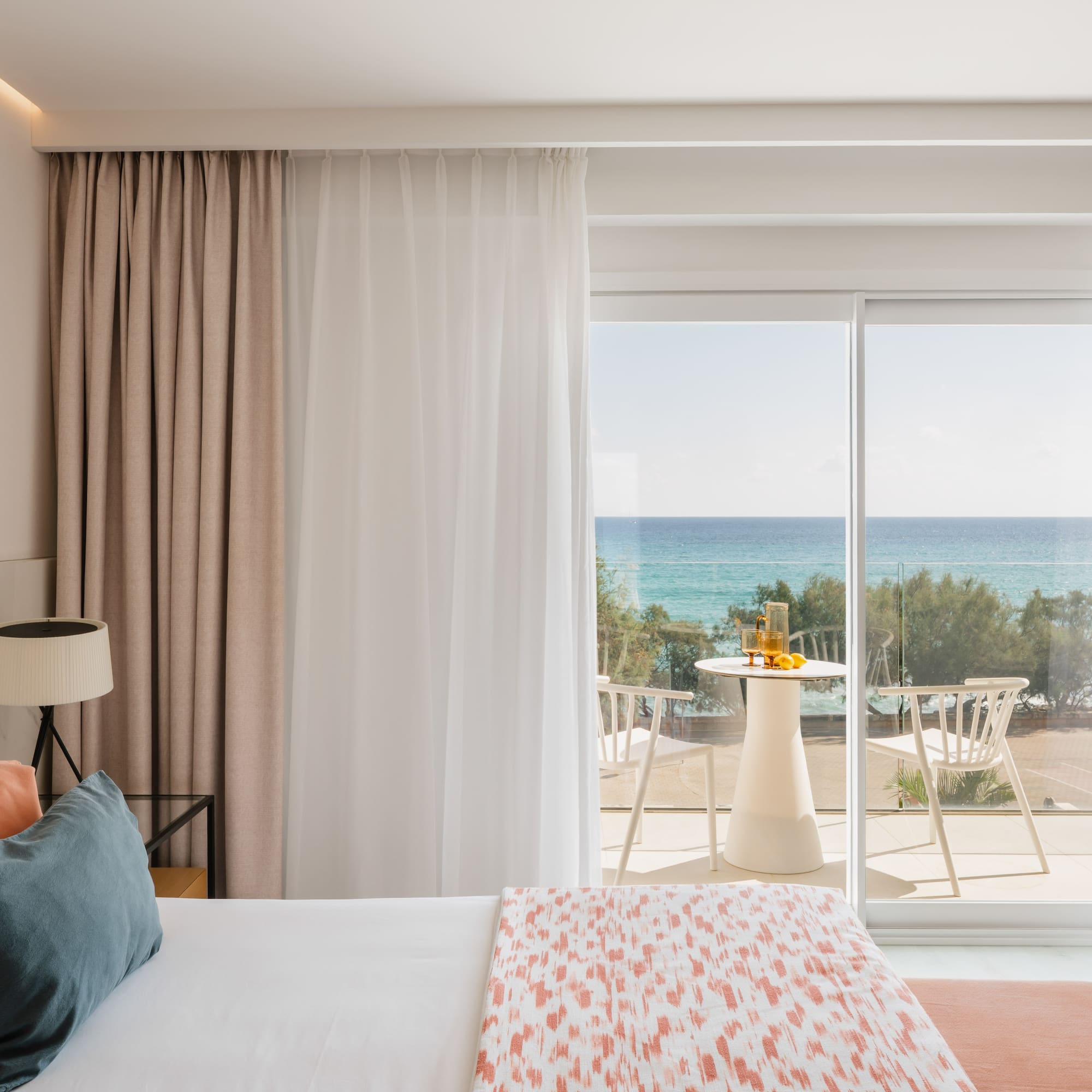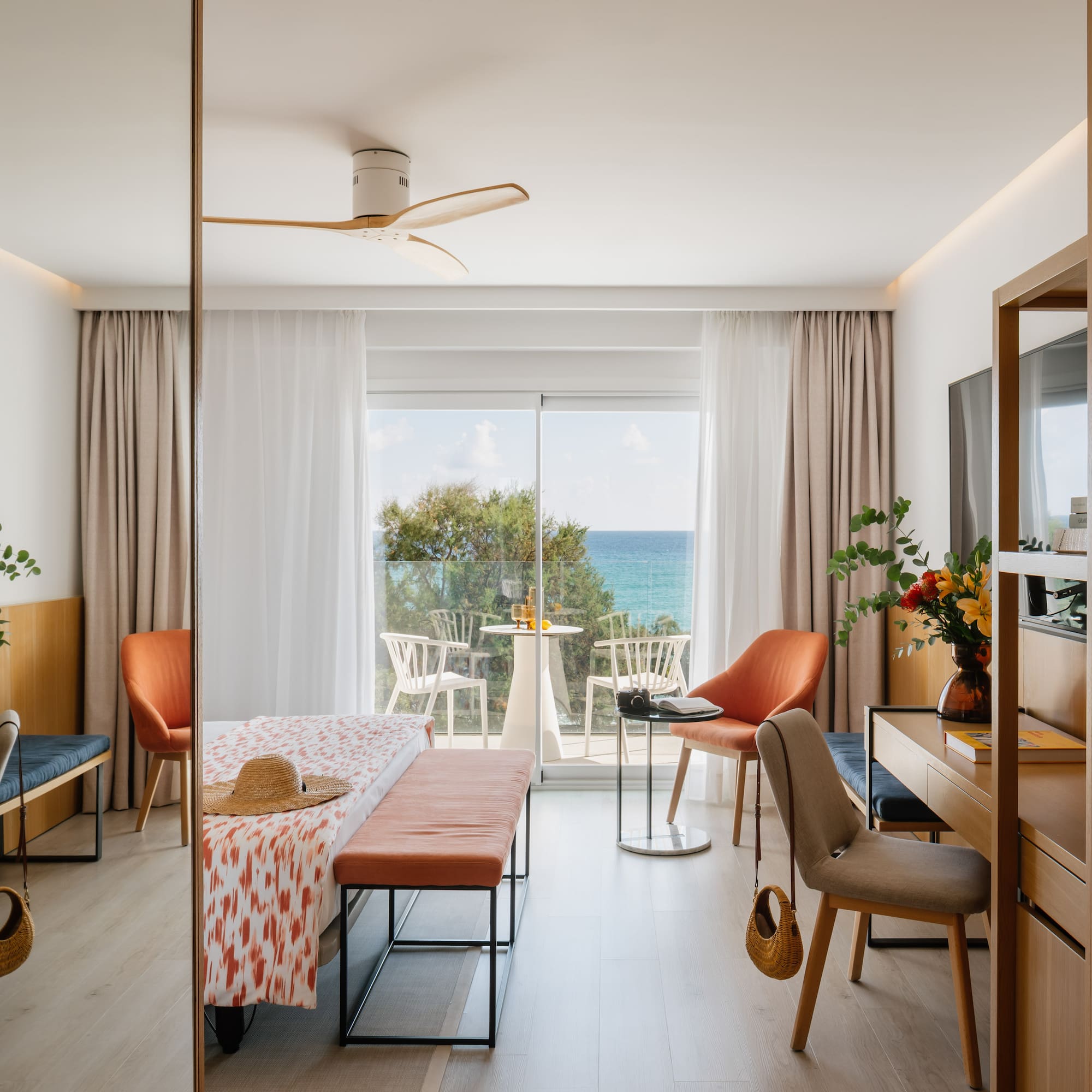 O cameră plină de lumină și eleganță, cu o terasă cu vedere privilegiată la mare. O combinație de spații mari și confort creează momente de adevărată stare de bine. O oază de relaxare însoțită de cea mai fină briză mediteraneană.