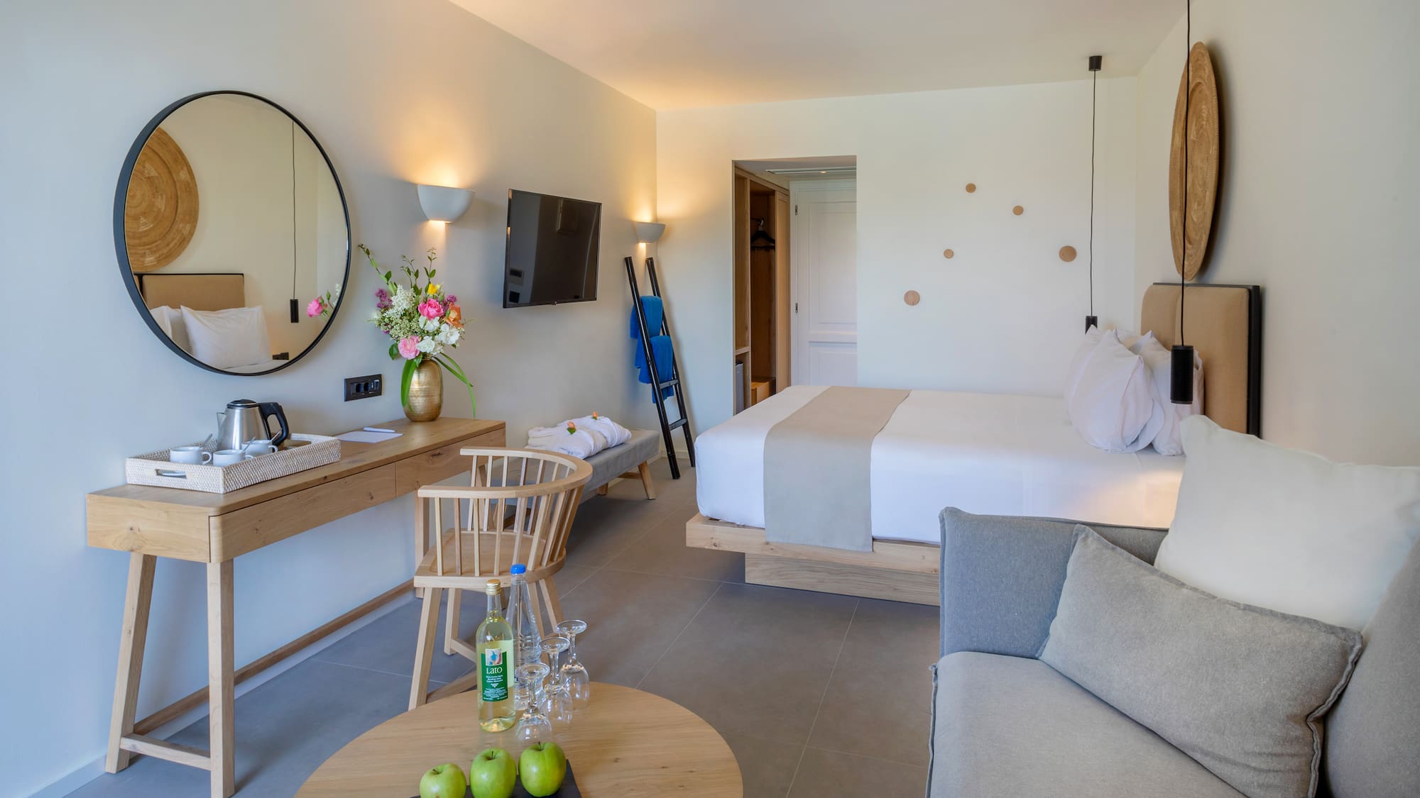 Suite huyền diệu có phòng khách theo phong cách bohemian và phòng ngủ lớn riêng biệt với hồ bơi riêng tuyệt vời. Được thiết kế đến từng chi tiết tốt nhất, hãy thưởng thức khung cảnh tuyệt đẹp của biển Stalis trong xanh.