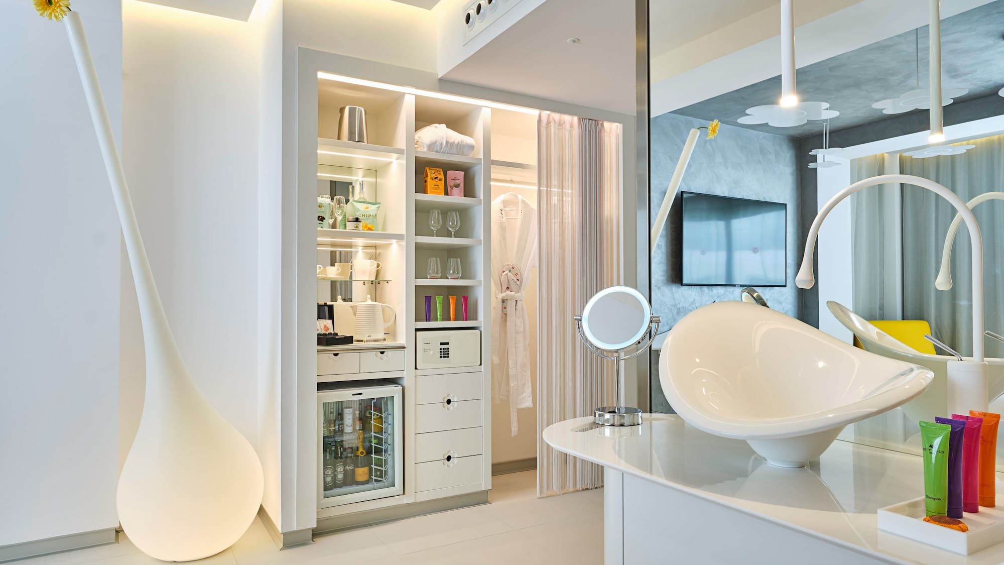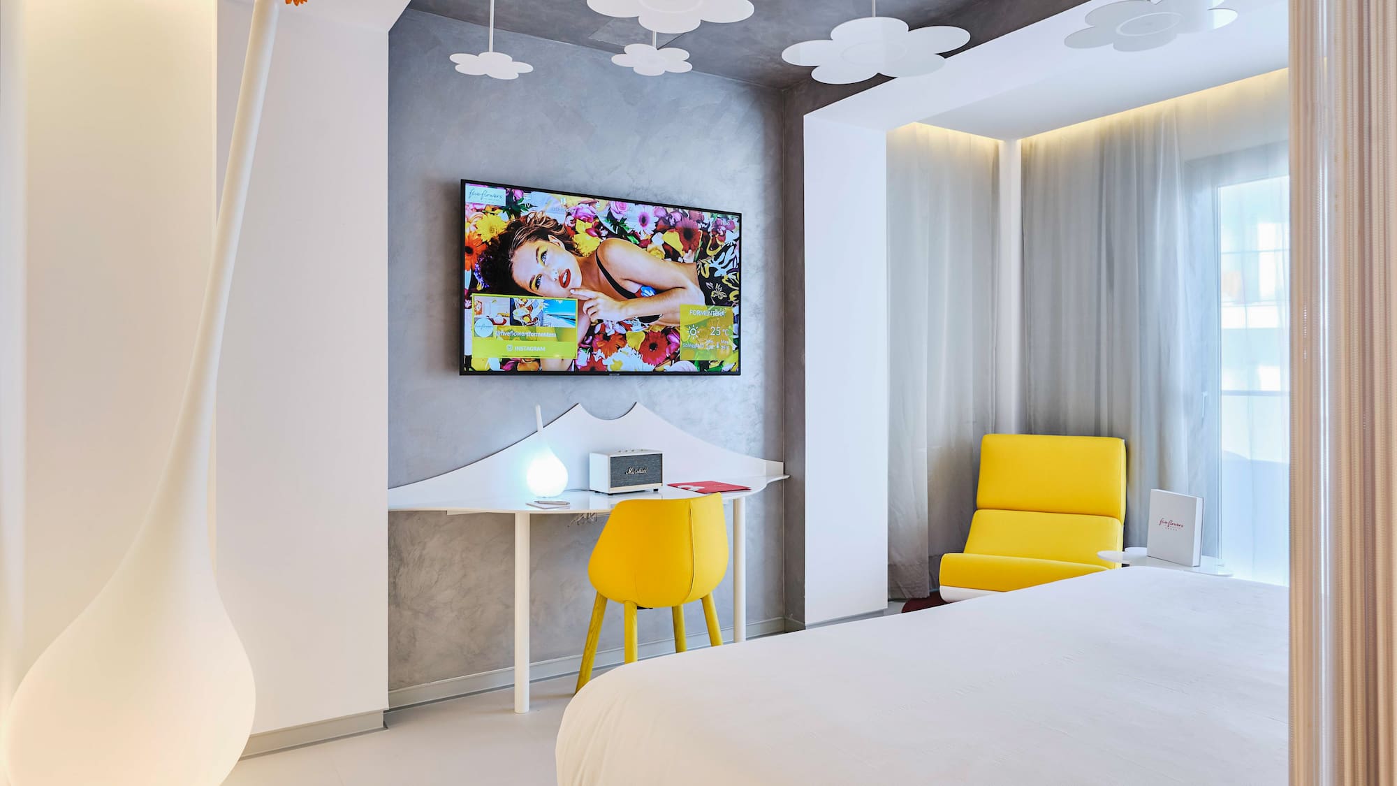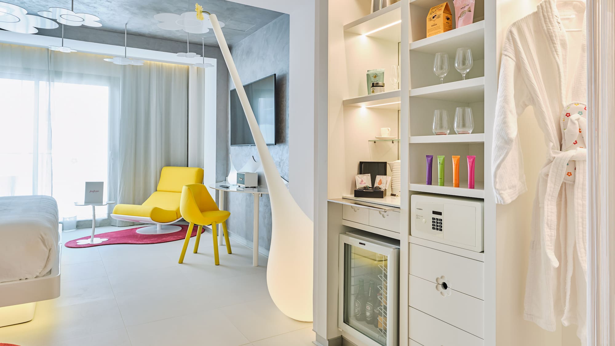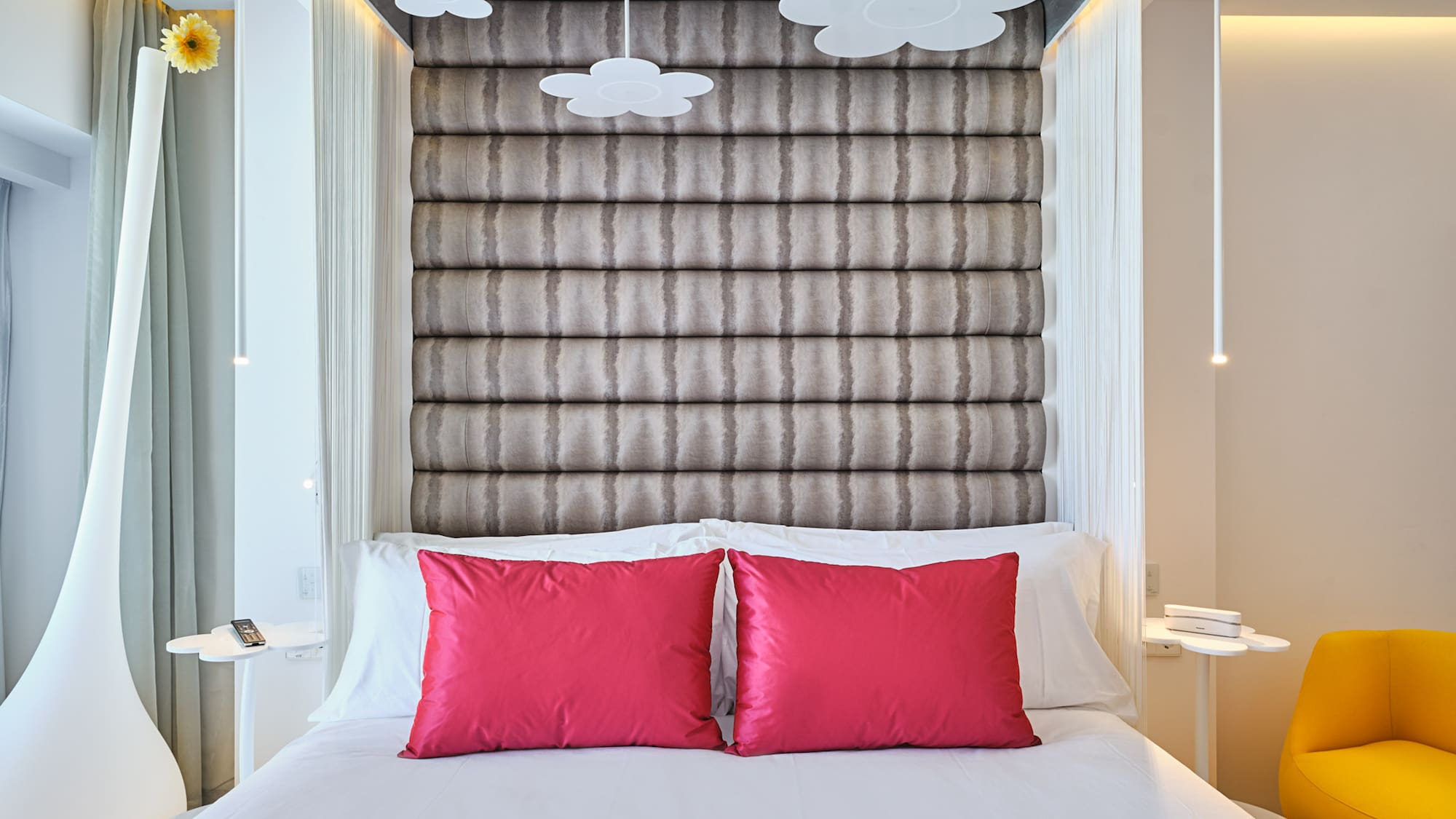 Thư giãn trong căn phòng đưa bạn quay ngược thời gian với thiết kế kết hợp đồ nội thất màu trắng và sáng lấy cảm hứng từ những năm 1960. Tận hưởng tầm nhìn tuyệt vời ra hồ bơi của khách sạn.