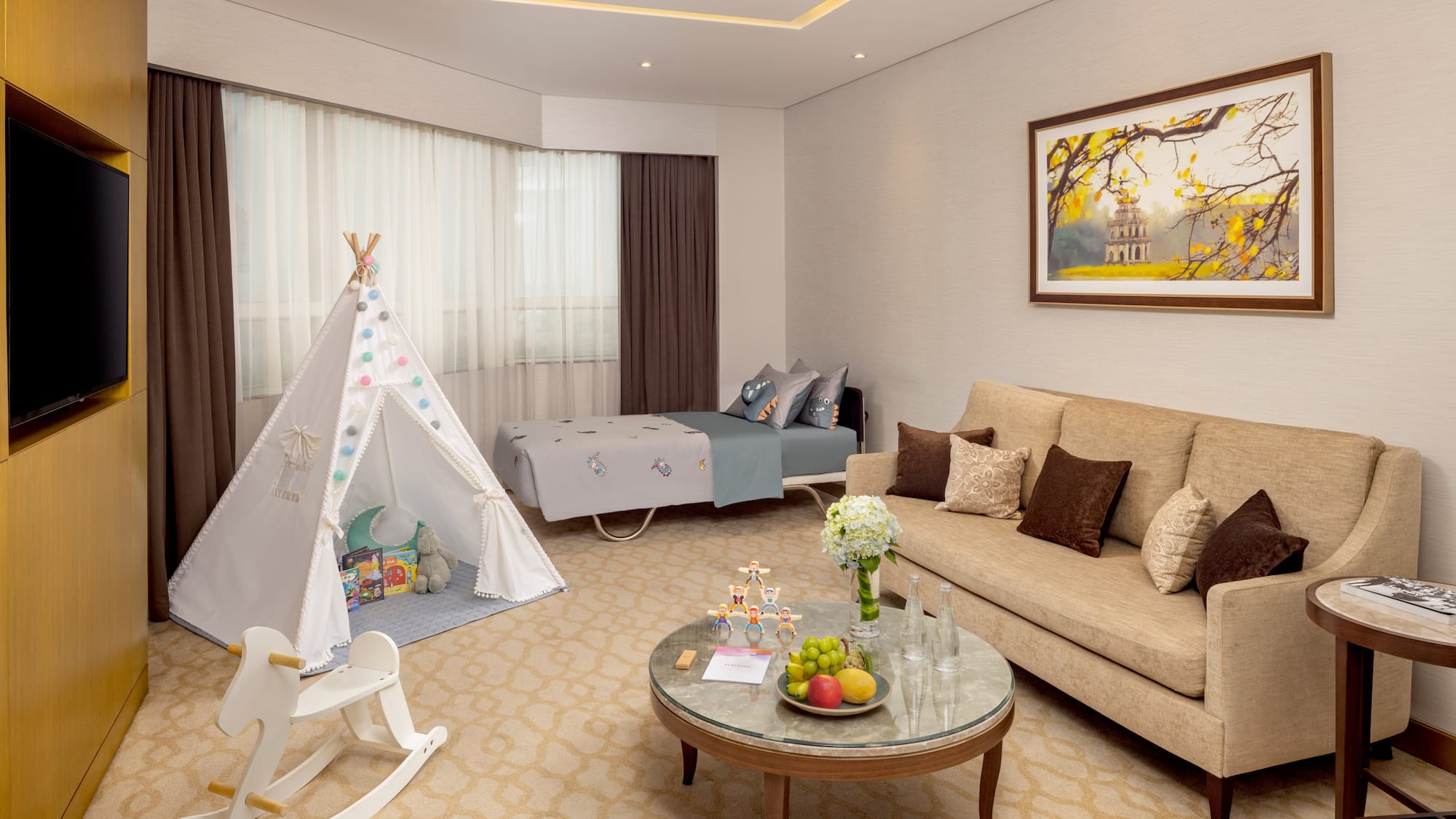 该套房是您正在寻找的完美家庭住所。房内设有一间主卧室、一间独立的客厅、一个主题帐篷和一张供孩子们(10 岁以下)使用的加床。另有摇摆木马和一系列儿童娱乐设施,为小朋友们带来无穷乐趣。